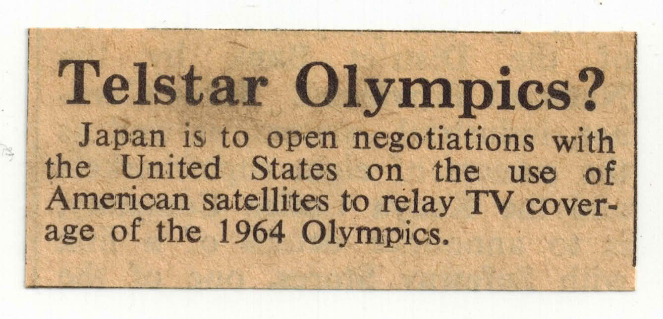 Scrapbook 3: Telstar Olympics? Prev | Index | Next Telstar Olympics? Japan is to open negotiations with the United States on the use of American satellites to relay TV coverage of the 1964 Olympics. Prev | Index | Next