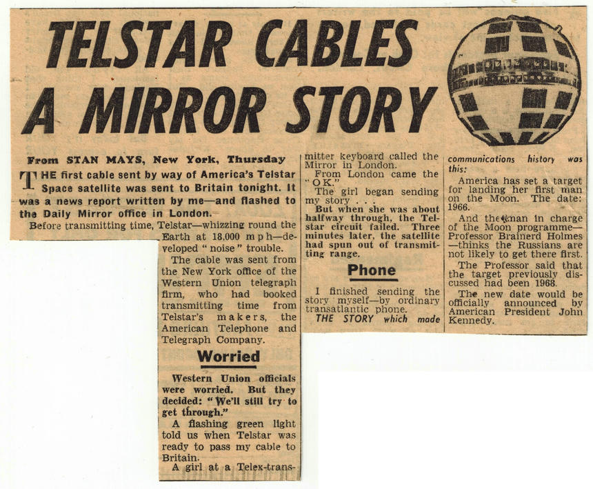 THE first cable sent by way of America’s Telstar Space satellite was sent to Britain tonight. It was a news report written by me—and flashed to the Daily Mirror office in London.